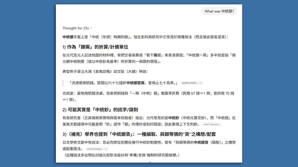 So, I asked ChatGpt, “What was 中統銀?”, meaning “What was Zhongtong silver?” It thought for 25 seconds, and then for some reason it responded in Chinese as follows: