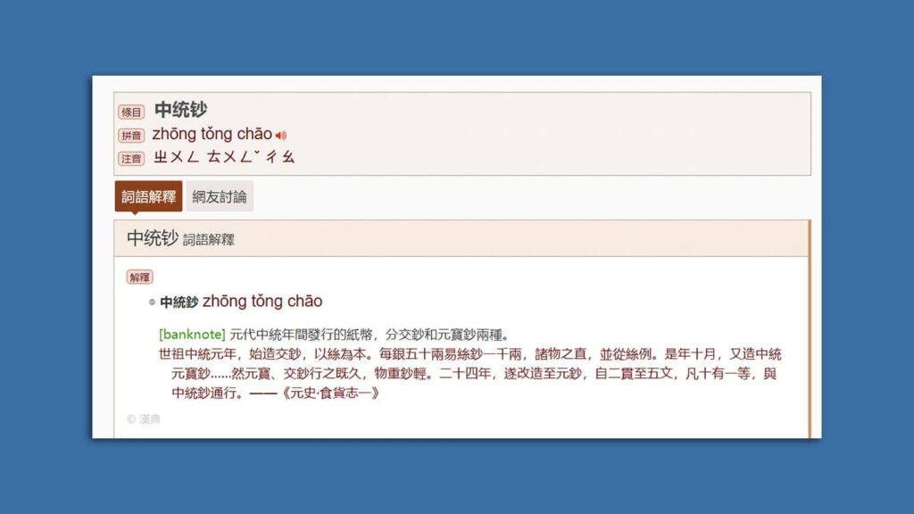 What came up was not “Zhongtong silver” but “Zhongtong bills/notes” (Zhongtong chao 中統鈔), with the definition saying “Paper money issued during the Zhongtong 中統 reign period of the Yuan dynasty, in two types: jiaochao 交鈔 and yuanbao chao 元寶鈔.”