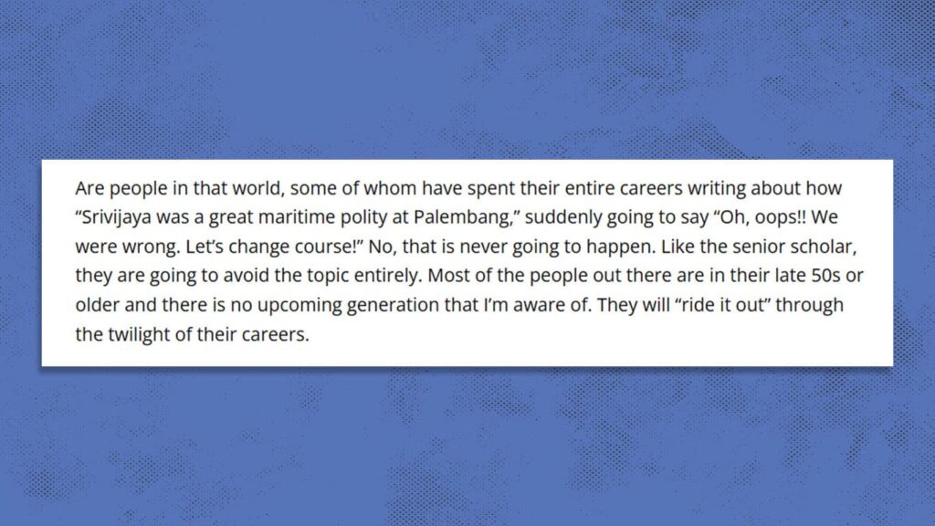 Are people in that world, some of whom have spent their entire careers writing about how “Srivijaya was a great maritime polity at Palembang,” suddenly going to say “Oh, oops!! We were wrong. Let’s change course!” No, that is never going to happen. Like the senior scholar, they are going to avoid the topic entirely. Most of the people out there are in their late 50s or older and there is no upcoming generation that I’m aware of. They will “ride it out” through the twilight of their careers.