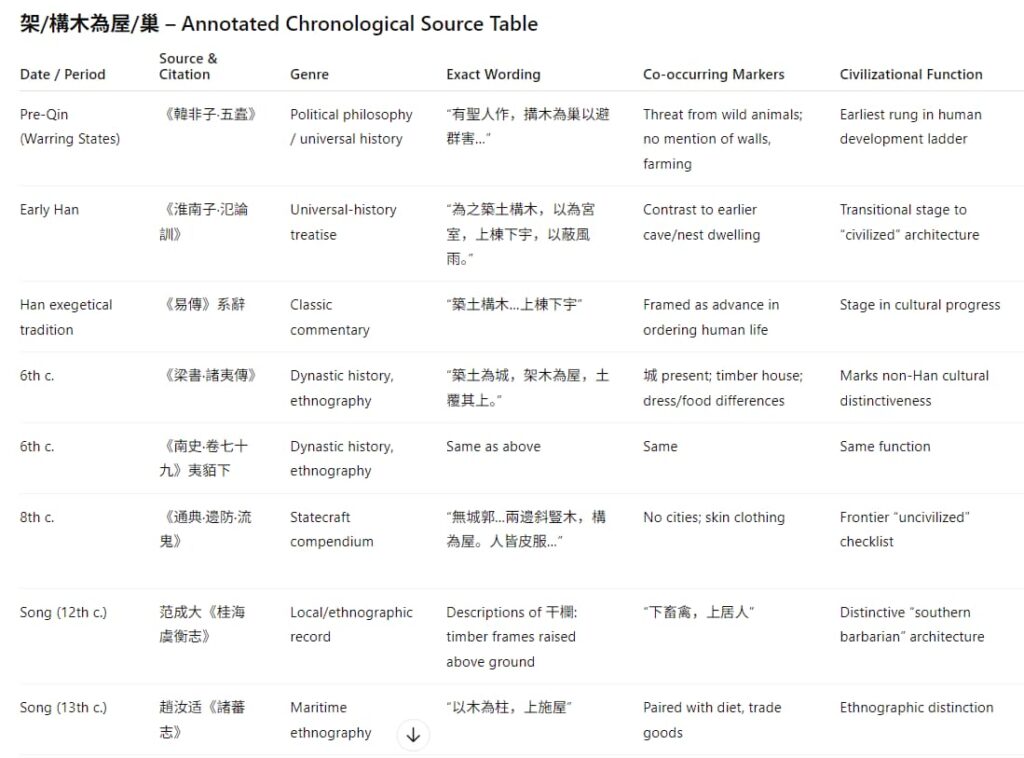 2. As an ethnographic marker of “otherness” – In dynastic histories, geographical treatises, and gazetteers, the detail appears alongside other markers of low development: “no walled cities,” “wear skins,” “dig holes for grain.” In such lists, “build houses on stilts” 架木為屋 is not just a building type — it is shorthand for a place lower on the civilizational ladder.
