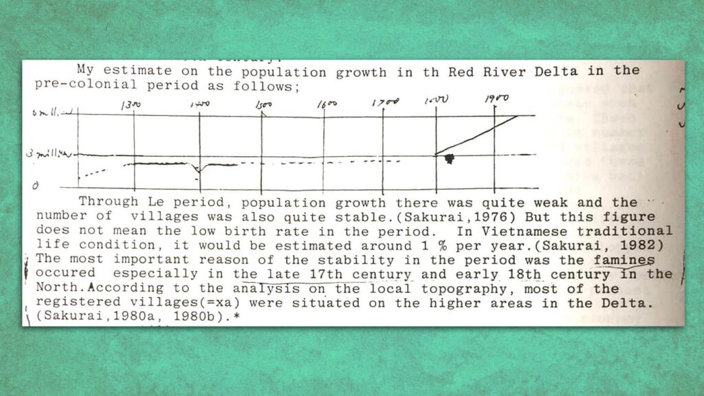 I was reminded of this type of scholarship yesterday when I was reading a chapter that was published three years ago and which talked about population growth in Vietnam in the fifteenth century and said, “According to some estimates, the population may have tripled in less than a century between 1417 and 1490, even as Vietnam’s territorial expanse had remained largely unchanged since before independence.”