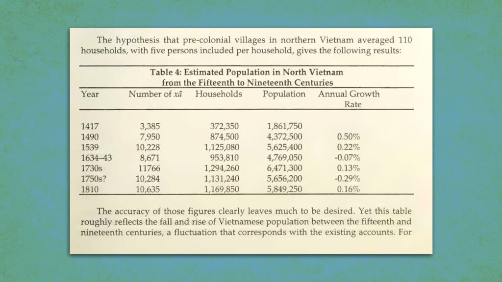 Then I decided to check the claim that “After analyzing chronicles, censuses, and village records for frontier areas as well as the delta, Li Tana has estimated that the population of northern Vietnam as a whole tripled during the early Le, from 1,862,000 in 1417, to 4,373,000 in 1490, to 5,625,000 in 1539. The number of villages (xa) rose proportionately (see Figure 4.2).”