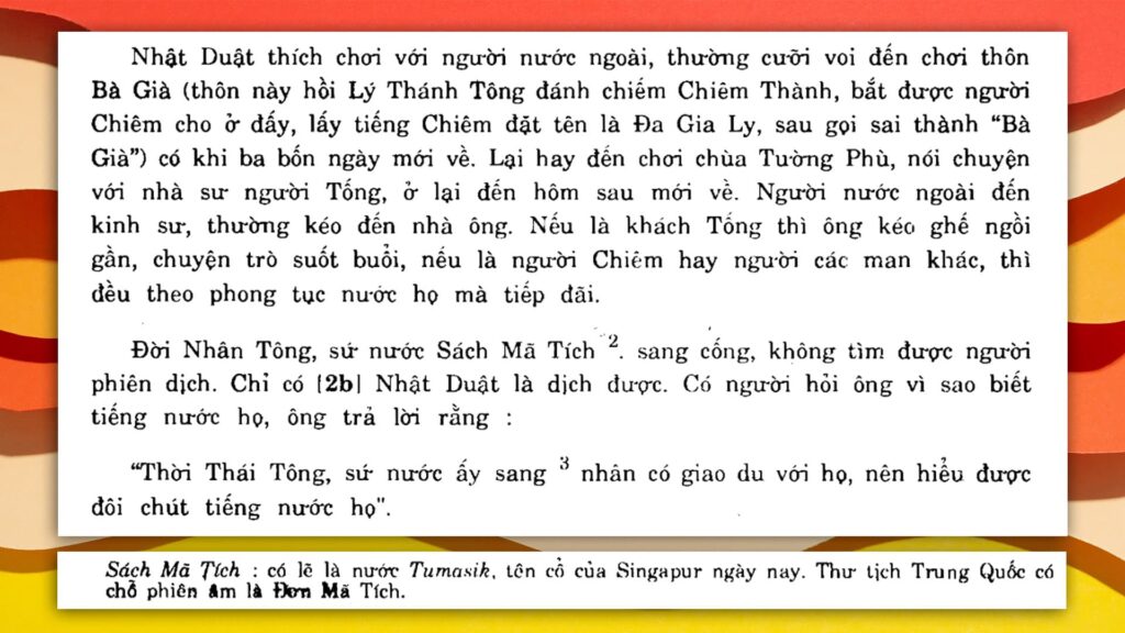 However, the information in the text makes it clear that regardless of how that name was pronounced, it was not referring to a place to the south of Vietnam, nor was it referring to a place where an Austronesian language similar to Cham, like Malay, was spoken. The DVSKTT says that Trần Nhật Duật was familiar with Cham, but that he understood a little bit of the language of the person from Sách Mã Tích because he had spent some time with an envoy from the Northern Kingdom (China).